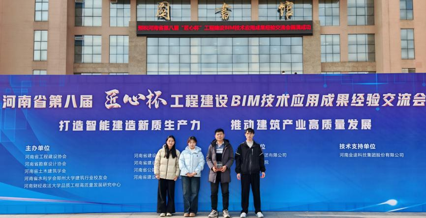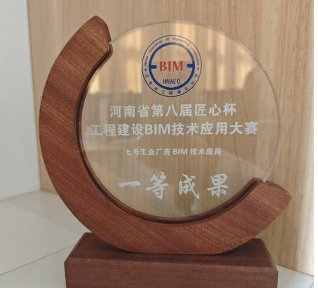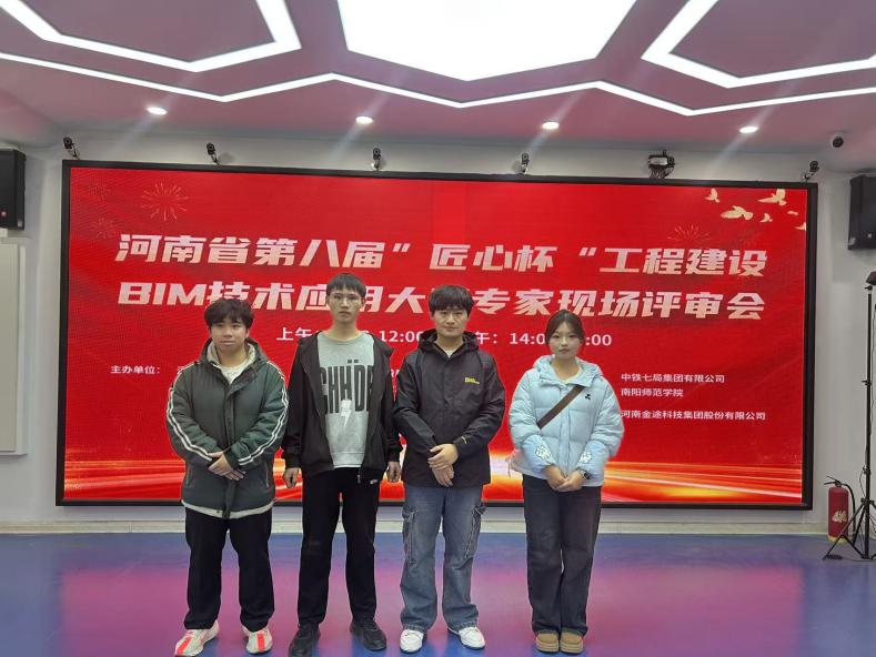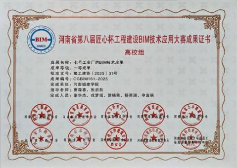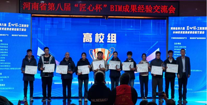 (通讯员 张启航 贾森春)2025年12月6日,河南省第八届“匠心杯”工程建设BIM技术应用大赛在河南财经政法大学成功举办,E8官网登录入口智能建造与交通工程公司BIM技术协同中心申报的“七号工业厂房BIM技术应用”项目凭借扎实的技术与突出的创新价值,在众多参赛作品中脱颖而出,荣获高校组一等成果。2026年1月10日,颁奖仪式在南阳师范公司隆重举行,项目指导老师贾森春、张启航代表团队领取荣誉证书与奖杯。